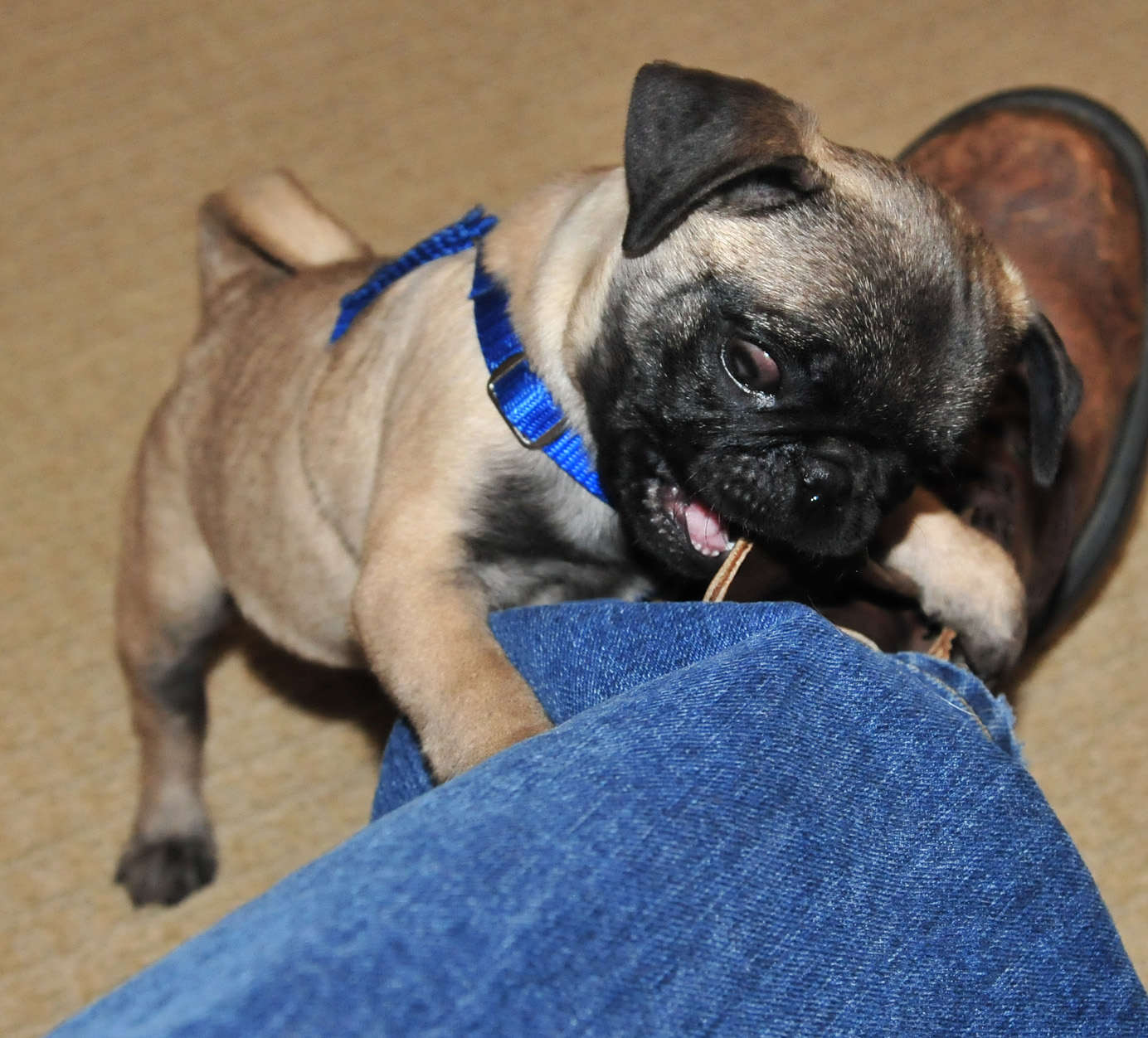Two weeks in, and we are really feeling our oats, so to say. Napoleon has turned into a none stop playing machine, playing with anyone and anything ... dogs, toy, shoes, shoe strings ... anything. We're sometimes amazed he manages to find so many toys, and he finds them so quickly. But then I guess we're always more worried about his handicap than he is. He still bumps into things ... the fence, a table, the tv stand -- one day hitting it so hard we heard the bonk a room away, and he yelped. But that stuff never seems to slow him down ... he takes it all in stride and just keep moving in his own special way ... mapping out the room by first turning a small circle and then turning progressively bigger and bigger circles until he thinks he owns the room.